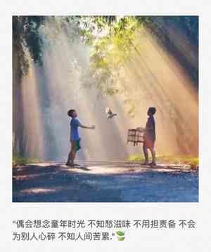 童年似一杯浓浓的咖啡,暖到你心窝,童年似一杯淡淡的茶,让你回味;童年似暴风雨的彩虹;五颜六色,炫丽无比;童年又似那晚霞后的余光,那么让人怀念;又似那弯弯的小路,让你成长。风儿不可能将这温馨的回忆给吹掉;雨儿不可能把这一件一件感人的旋律掩没,只有可爱的阳光将它照射,将它保存。